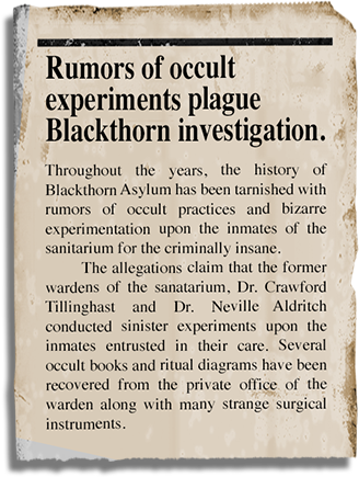 Investigate the Doctor's Office View the Recently Committed Buy the Blackthorn Asylum CD