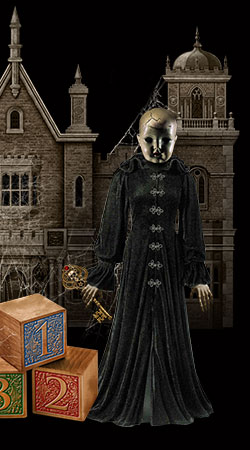 You follow the ghostly voice to the nursery where an old doll house sits upon a central table. The house is an exact replica of the mansion, and a lone doll stands before the front door. Its tiny hands hold a miniature skeleton key. Other dolls line the shelves watching you with eyes that glisten in the darkness. Their porcelain faces, cracked and weathered by time, seem remotely familiar.
